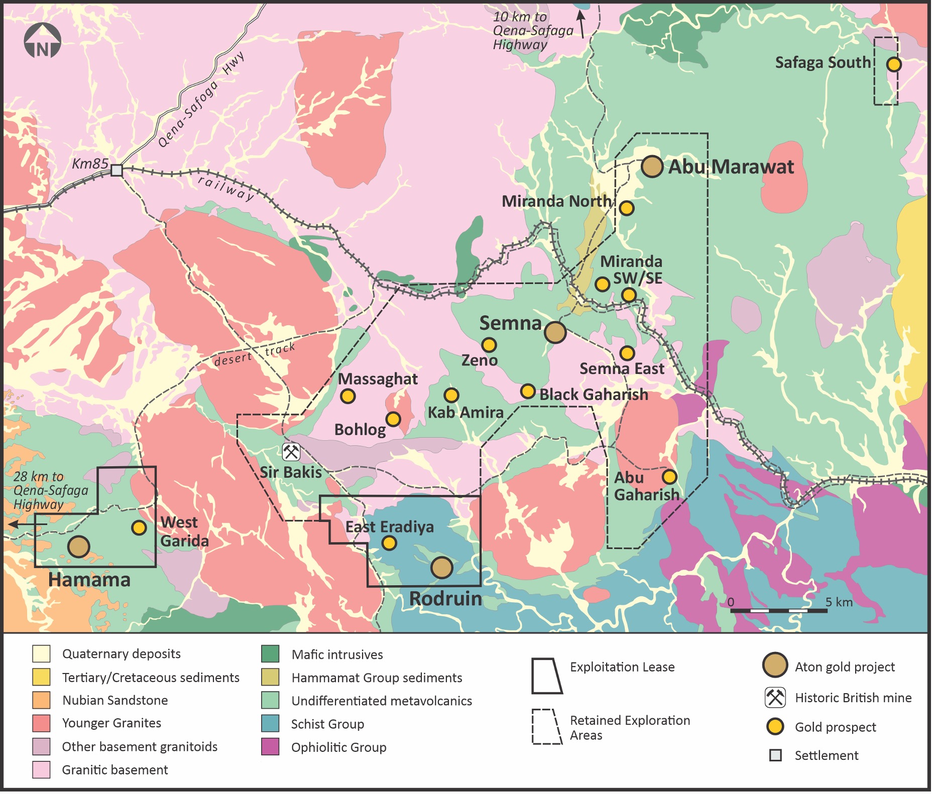 Aton Resources Inc. (AAN: TSX-V) is focused on its 100% owned Abu Marawat Concession ("Abu Marawat"), located in Egypt's Arabian-Nubian Shield, approximately 200 km north of AngloGold Ashanti's world-class Sukari gold mine. Aton has identified numerous gold and base metal exploration targets at Abu Marawat, including the Hamama deposit in the west, the Abu Marawat deposit in the northeast, and the Rodruin deposit in the south of the Concession. Two historic British gold mines are also located on the Concession at Semna and Sir Bakis. Aton has identified several distinct geological trends within Abu Marawat, which display potential for the development of a variety of styles of precious and base metal mineralisation. The Abu Marawat exploitation lease is 57.66 km2 in size, covering the Hamama West and Rodruin mineral deposits, and was established In January 2024 and is valid for an initial period of 20 years. The Concession also includes an additional 255.0 km2 of exploration areas at Abu Marawat, retained for a further period of 4 years from January 2024. Abu Marawat is located in an area of excellent infrastructure; a four-lane highway, a 220kV power line, and a water pipeline are in close proximity, as are the international airports at Hurghada and Luxor.