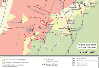 28 diamond drill holes were drilled at Semna, for a total of 4,701m, and were designed to test the Main Vein zone, and its eastern extension, with 2 short holes testing the Eastern Adit Vein;