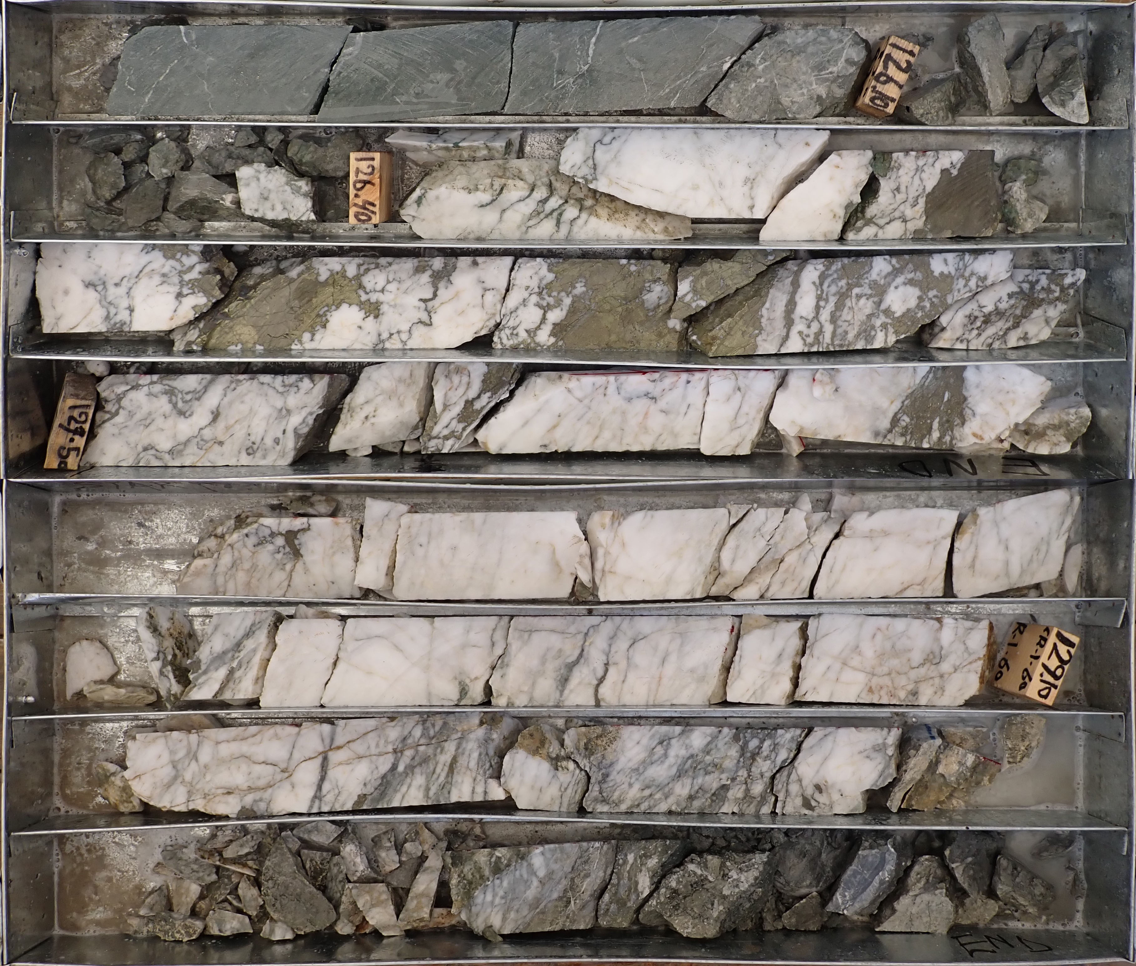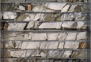 Figure 3: Split drill core from hole SMD-048, 125.63-130.30m depth, with semi-massive chalcopyrite in vein quartz