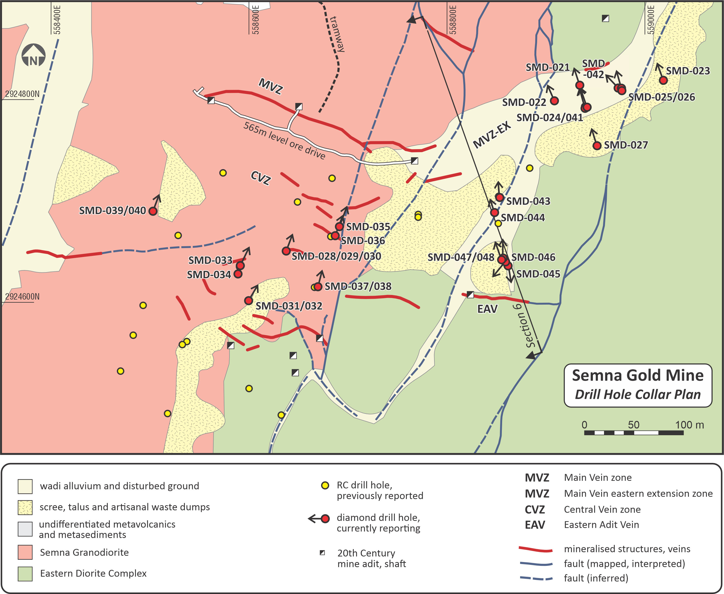 21 drill holes, SMD-021 to SMD-048, were completed at the Semna prospect, for a total of 4,701m metres during the recently completed phase 2 diamond drill programme (Figure 2), with most of the holes drilled at HQ size. The programme was primarily designed to test for mineralisation in the MVZ-EX zone which appears to strike in an east-northeasterly direction to the east of the old British mine workings, where it is buried beneath wadi sediments. Other holes tested the depth extension of the Main Vein zone ("MVZ") which was exploited underground in the 1900's, and the Eastern Adit Vein. Full collar details of the holes are provided in Appendix A. Half core samples were routinely assayed for gold, silver and copper, with samples from the first 5 holes of the programme also assayed for lead and zinc.