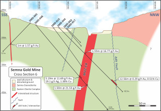 The mineralisation at Semna has to date been drilled over a strike length on the MVZ of approximately 500m and is open at depth and to the east of the MVZ-EX zone. Holes SMD-040 and SMD-041 appear to suggest that the MVZ is weakening at its western extent, which coincides with observations from underground.