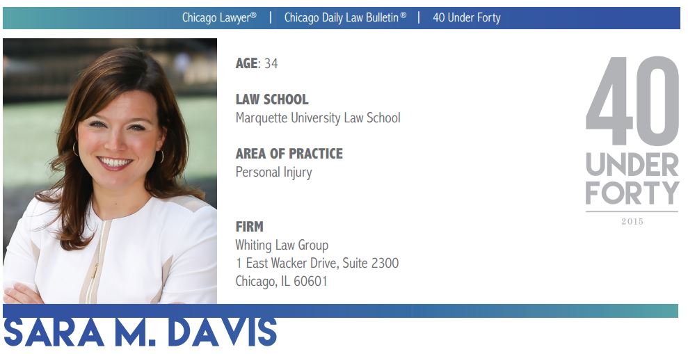 CHICAGO, Ill., December 1, 2015 (Newswire.com) - The Whiting Law Group, Ltd. is pleased to announce that attorney Sara M. Davis has been selected for in inclusion in Chicago Daily Law Bulletin’s “40 Under 40” list. This significant honor reflects the fact that Ms. Davis is viewed as an up and coming attorney by other lawyers in Illinois and further establishes her as a leading personal injury and construction accident attorney in the state.