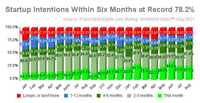 NORFOLK, Va., September 8, 2021 (Newswire.com) - Entrepreneurs who agree or strongly agree that "now is a good time to start a business" were 67.9% in August, up slightly from July, but down from the record level of 76.9% reached in June 2021. Nonetheless, a record 78.2% aspiring owners anticipate starting their businesses within six months. FranchiseInsights.com compiles monthly the Small Business Startup Sentiment Index™ (SSI) of individuals who have recently inquired about businesses for sale.
