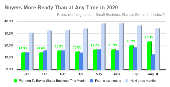 In a welcome sign of small business optimism amid the pandemic, responses collected Aug. 20-26, 2020 for the FranchiseInsights.com Small Business Startup Sentiment Index™ revealed a new high point for buyer readiness in 2020. Over 23% of aspiring business owners indicated plans to “buy or start a business this month” – the fourth consecutive month of increasing near-term readiness, and a sharp increase over pre-Covid-19 survey responses.