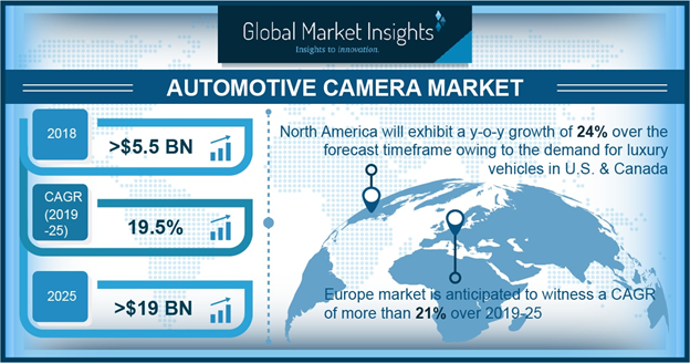 Selbyville, Delaware, May 24, 2019 (Newswire.com) - The automotive camera market is anticipated to hike from USD 5.5 billion in 2018 to around USD 19 billion by 2025 when the global industry shipments will register 17% growth, according to a 2019 Global Market Insights, Inc. report. The changing preferences of automobile manufacturers toward the replacement of side-view mirrors with cameras to offer a wide rear view for drivers are expected to elevate the market growth.