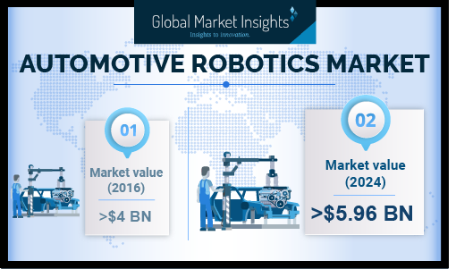SELBYVILLE, Del., March 26, 2020 (Newswire.com) - According to the latest report “Automotive Robotics Market by Product (Articulated, Cartesian, SCARA, Parallel, Cylindrical), Component (Hardware [Controllers, Arms, End Effector, Drive, And Sensor], Software & Services), Application (Welding, Assembly, Processing, Handling Operations, Paint & Dispense), Regional Outlook, Price Trends, Competitive Market Share & Forecast 2024”, by Global Market Insights, Inc., the market valuation of automotive robots will exceed $5.9 billion by 2024.