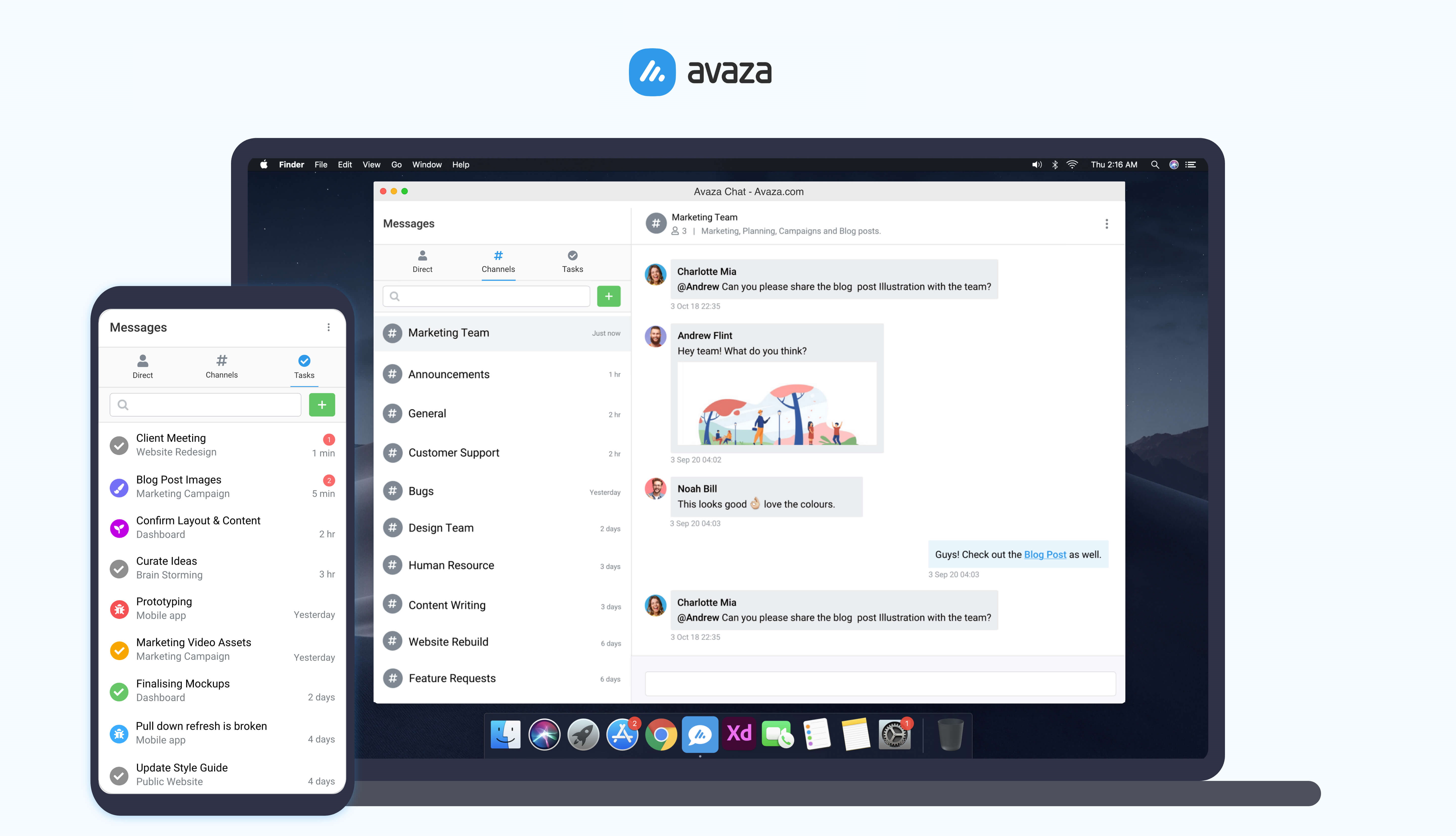 Avaza Chat packs all the features that small and medium-sized businesses need to enable company-wide collaboration into one familiar, friendly, and intuitive chat app.
