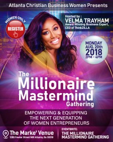 ATLANTA, August 3, 2018 (Newswire.com) - Atlanta Christian Business Women presents “The Millionaire Mastermind Gathering” hosted by Velma Trayham, CEO of ThinkZILLA Consulting Group, Aug. 20 from 2 p.m. to 4 p.m. at The Marke’ Venue at 1200 Fowler Street, NW Atlanta, GA 30318.