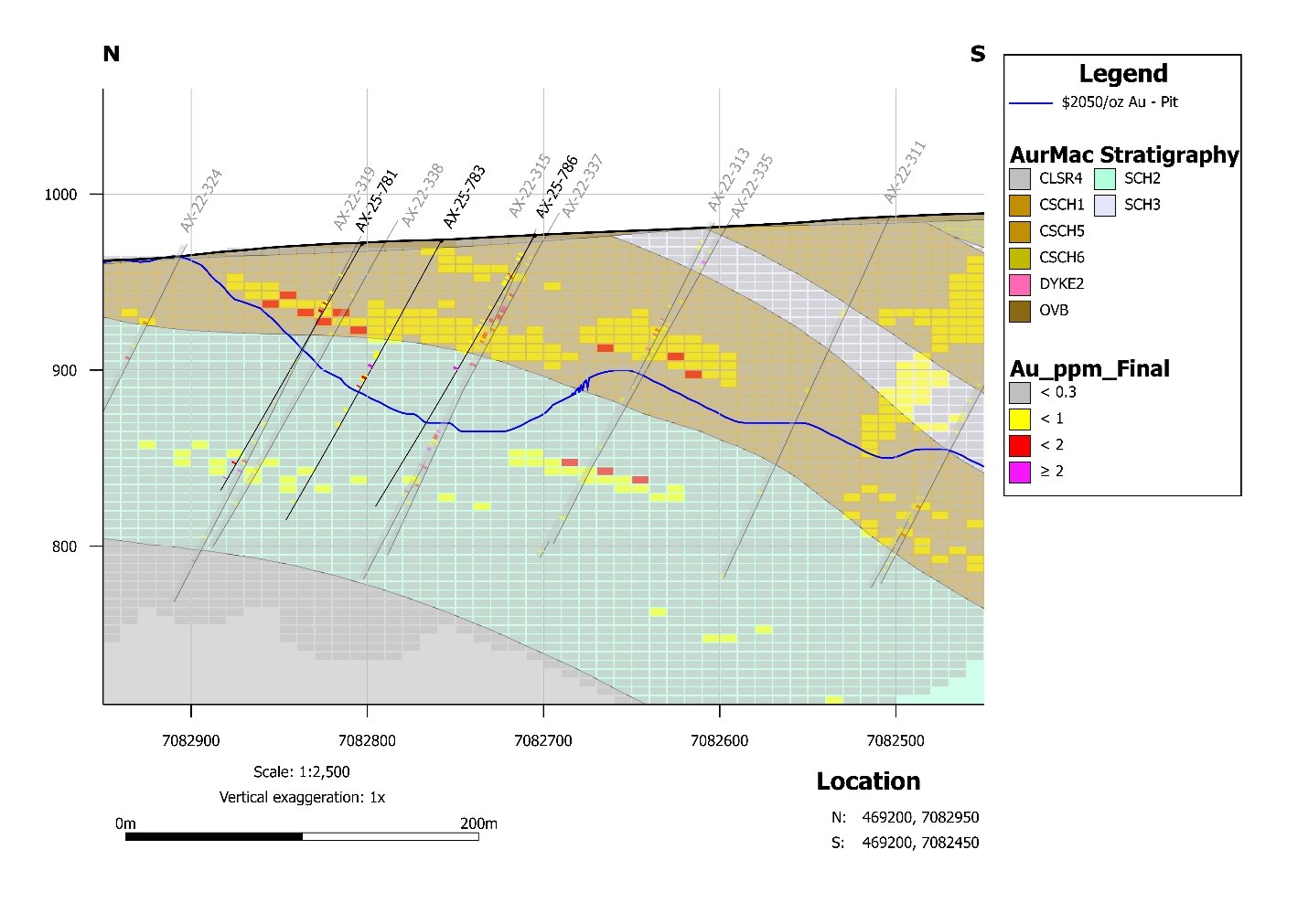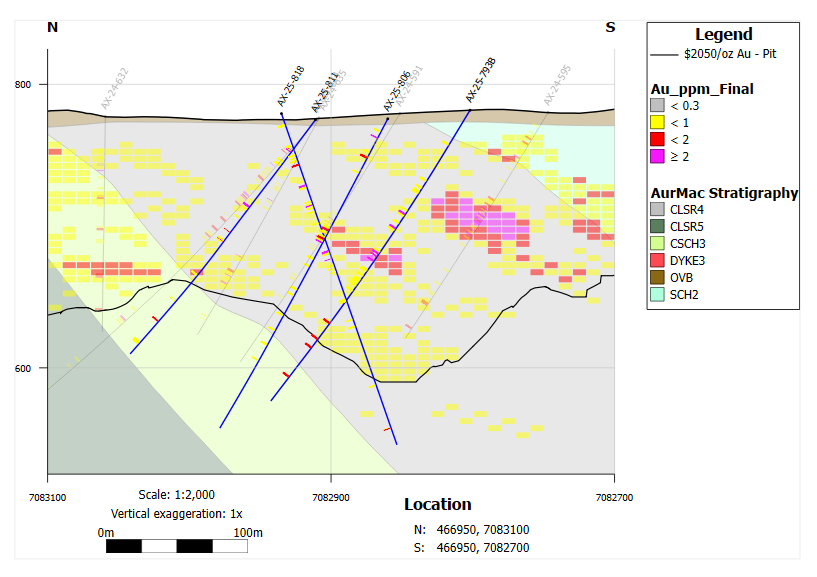 Figure 5: High-grade mineralization near surface in drillhole AX-25-800B has potential to convert additional waste blocks in the Eastern Powerline (Aurex Hill) satellite pit.