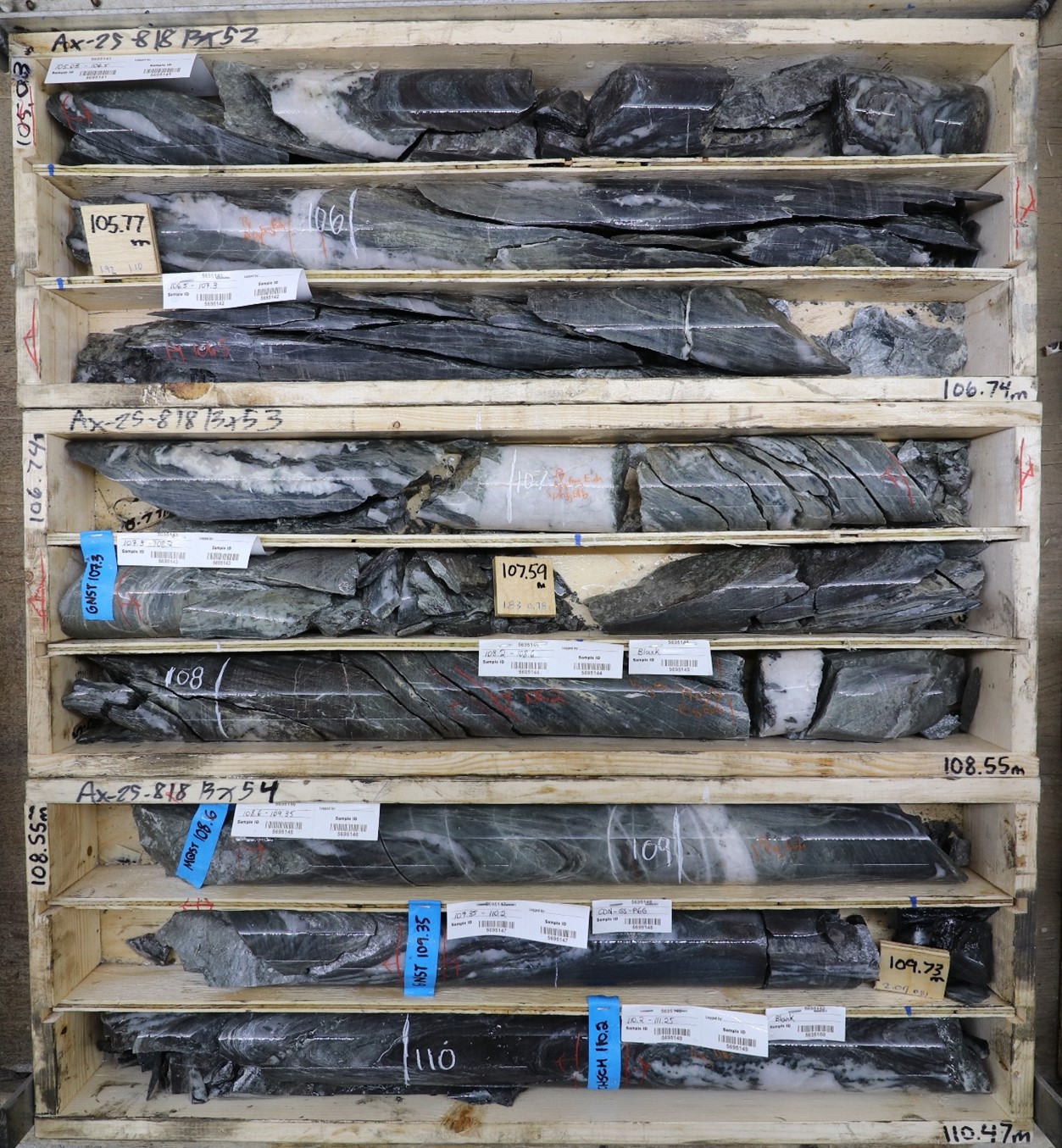 Figure 3: Diamond drill core from AX-25-818. Sheeted veins cutting metasedimentary rocks of the Hyland group, typical of the Powerline deposit hosting trace Bismuth sulphosalts, arsenopyrite and visible gold (See Figure 2).