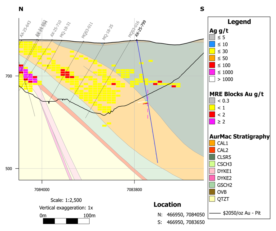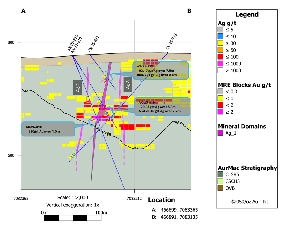 AX-25-819 - 20.35 g/t silver over 5.8m and 27.43 g/t silver over 7.7m