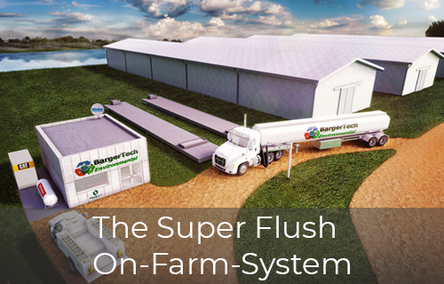 Barger Tech offers two distinct patent-pending environmental technologies combined within their BEST Plan system: an on-farm waste-flushing system (Super Flush™) and a centralized organic environmental reclamation plant (Lagoon Eliminator™) that eliminates the open-air lagoon and spray-field method of managing waste. The on-farm Super Flush™ system treats the effluent, recycles water on the farm, and transports remaining waste to the centralized processing center (Lagoon Eliminator™) for additional treatment and subsequent extraction of valuable commodities.