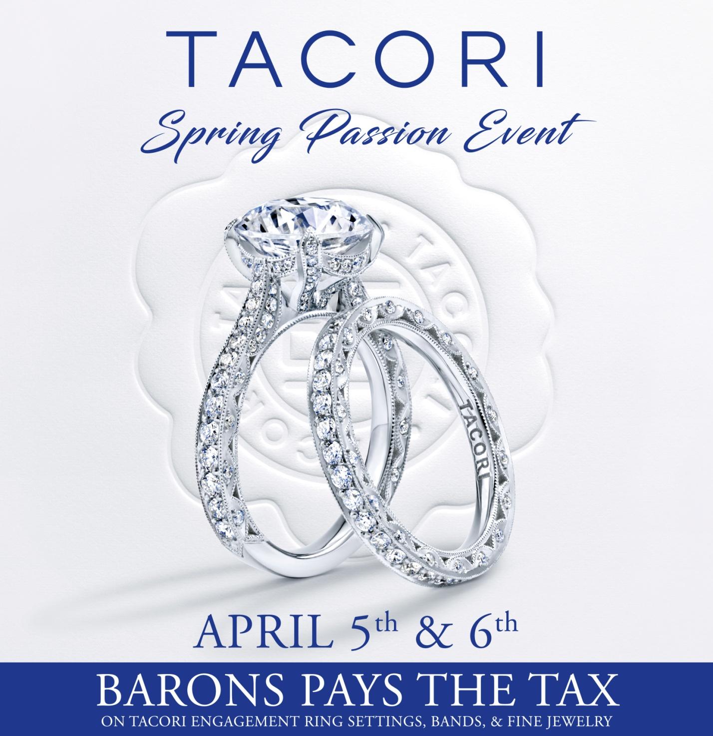 Additionally, BARONS Jewelers will pay the sales tax on all Tacori purchases made during these two days. (The tax-free offer excludes engagement ring center stones and is not valid on prior purchases or layaways.)