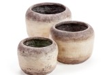 The pots are a trio of a small piece, a medium-sized piece and a large piece. The top edge and bottom edge of the pots have a slightly darker, almost grey appearance as compared to the concrete-white tone of the body of the pots.