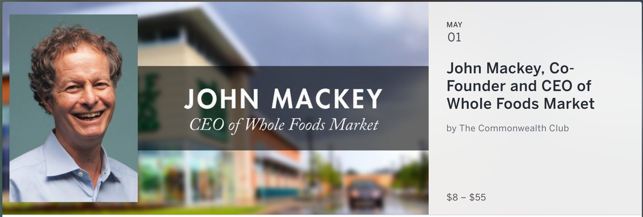 Please urge the Commonwealth Club to hold Whole Foods CEO John Mackey accountable and cancel his appearance. Call 415-597–6700, email CEO Gloria Duffy, [email protected], or tweet at @cwclub