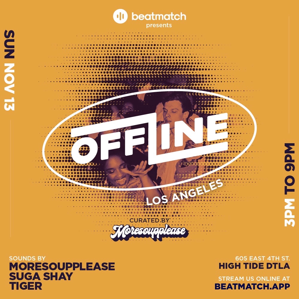 OFFLINE hosts its first event this Sunday, Nov. 13 at 3 p.m. at the beautiful High Tide DTLA bar. For a few hours a month, Beatmatch asks people to turn off their phones, unplug, and disconnect from the ever-draining digital world. Sounds will be curated by MORESOUPPLEASE, who recently performed at both Rolling Loud and AFROPUNK music festivals, with help from Suga Shay, and Tiger.