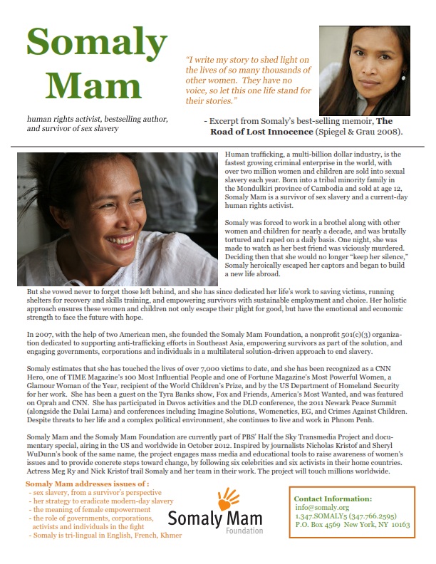 Somaly Mam is a human rights activist, bestselling author, and survivor of sex slavery who was born into a tribal minority family in Cambodia, and sold into slavery at the age of 12. In 2007, the Somaly Mam Foundation was established- a non-profit organization dedicated to supporting anti-trafficking efforts in Southeast Asia. The foundation works to engage governments, corporations, and individuals in a multilateral solution-driven approach to end human trafficking.