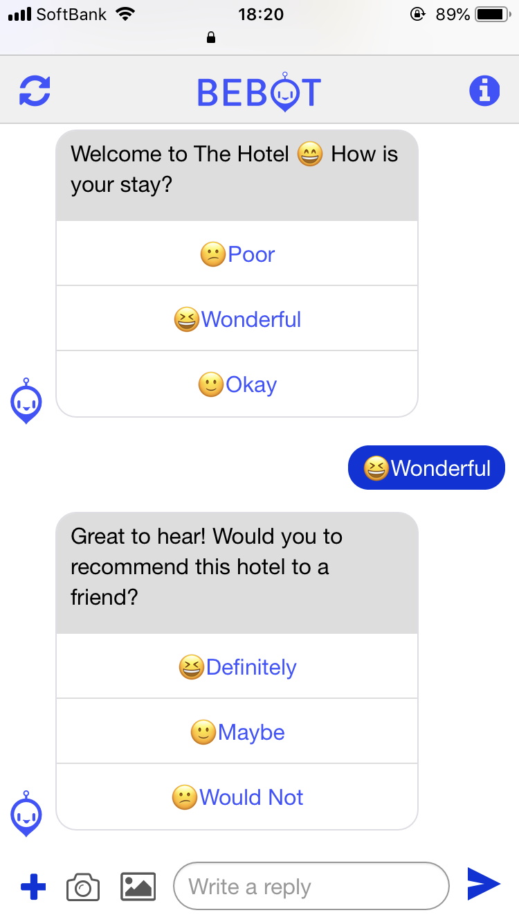 After a straightforward onboarding to the service in as little as 15 minutes, your business is ready to begin collecting insights. Customers are guided to Bebot after completing the wifi authentication pages from connecting their devices to the internet. Instead of seeing the business's website, which is often ignored by customers already in the store, users are redirected into a Bebot chat window. From first-time visitors to loyal customers, each user is provided with specialized assistance by Bebot. Guests can offer feedback through the chatbot so each business can improve their services based on popular customer opinions. Businesses also have the opportunity of promoting new products or services through the chat.