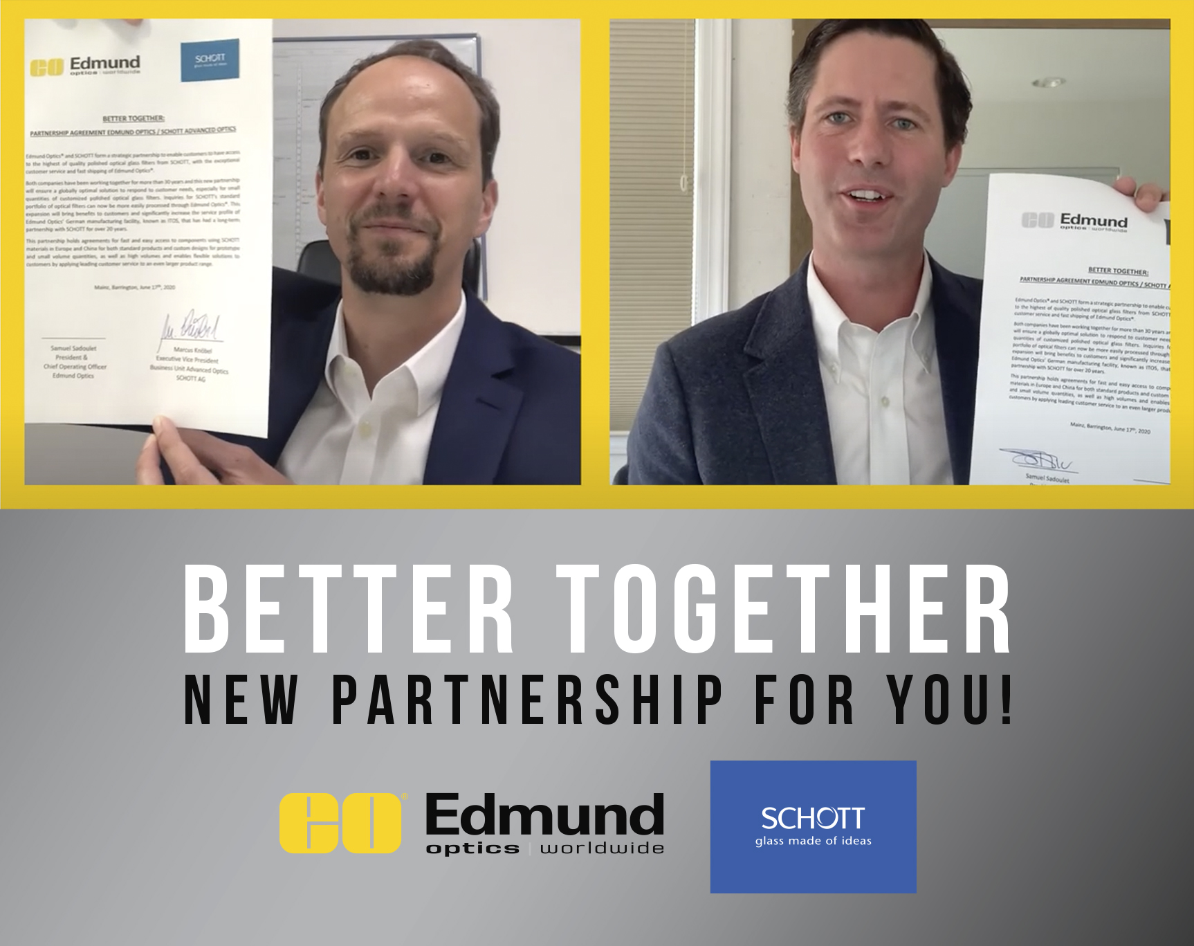"We are now working even closer together," Marcus Knobel, Executive Vice President of SCHOTT’s Business Unit Advanced Optics and Samuel Sadoulet, President and COO of Edmund Optics, jointly stated. "This enhanced partnership enables both brands to provide many additional benefits to customers."
