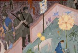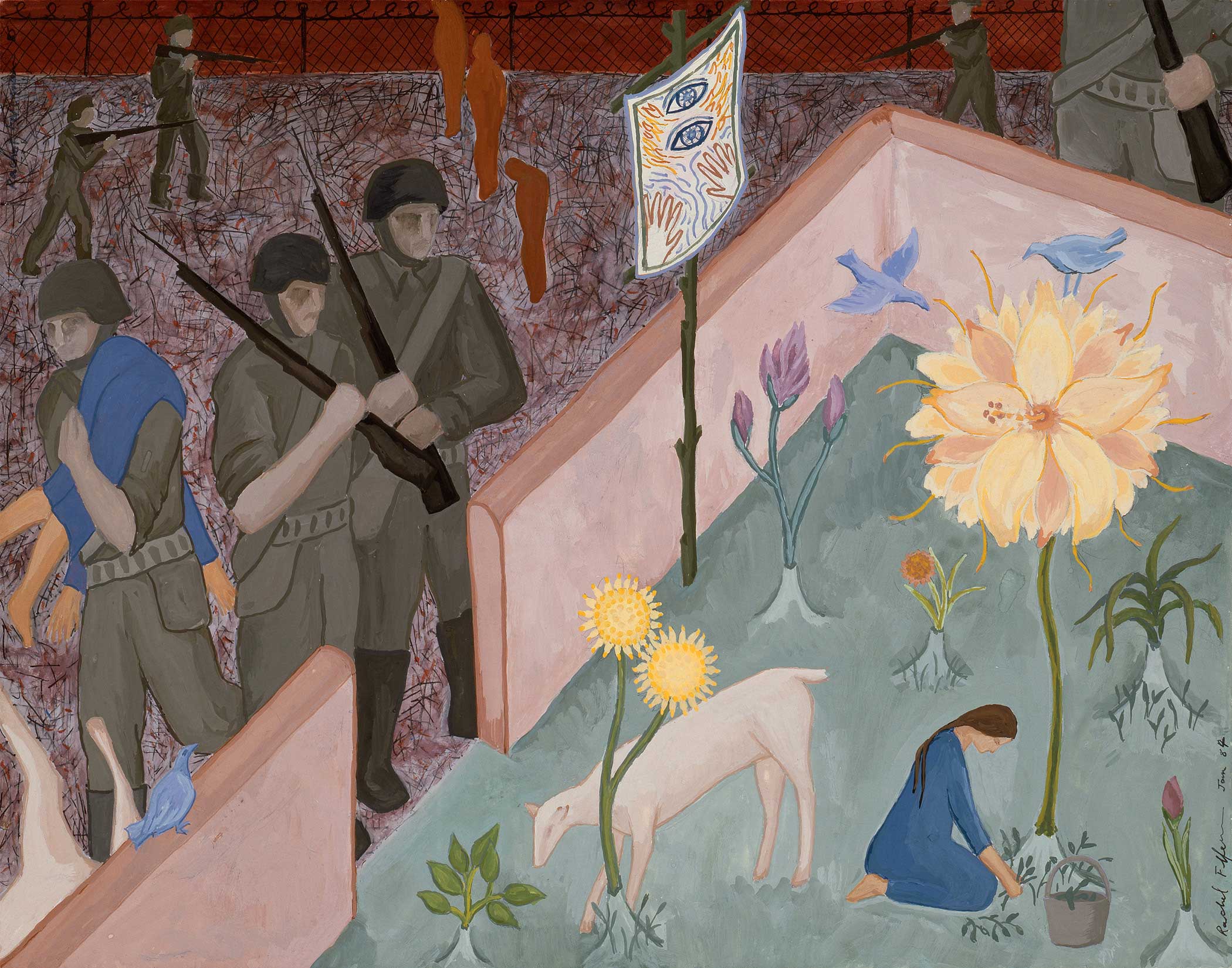 Though largely figurative and narrative, Feferman’s work does not fit easily into any school. She was influenced by Chagall, Matisse, and Cezanne, and later by Dürer, Rembrandt and¾as well¾the outsiders Blake and Kahlo. Her work early and late focused on joyous and whimsical images of animals, plants and humans in harmony. Her feminine perspective and fascination with “women’s work” is often both the medium and the message. In real life, sewing, cooking and the garden were also works of art; the joys she felt about ordinary beautiful things are reflected in greeting cards, bowls, pitchers, teapots and textiles. By contrast, many of her mature works, especially the gouaches and drawings, ruminate on the horrors of war, violence and violation.