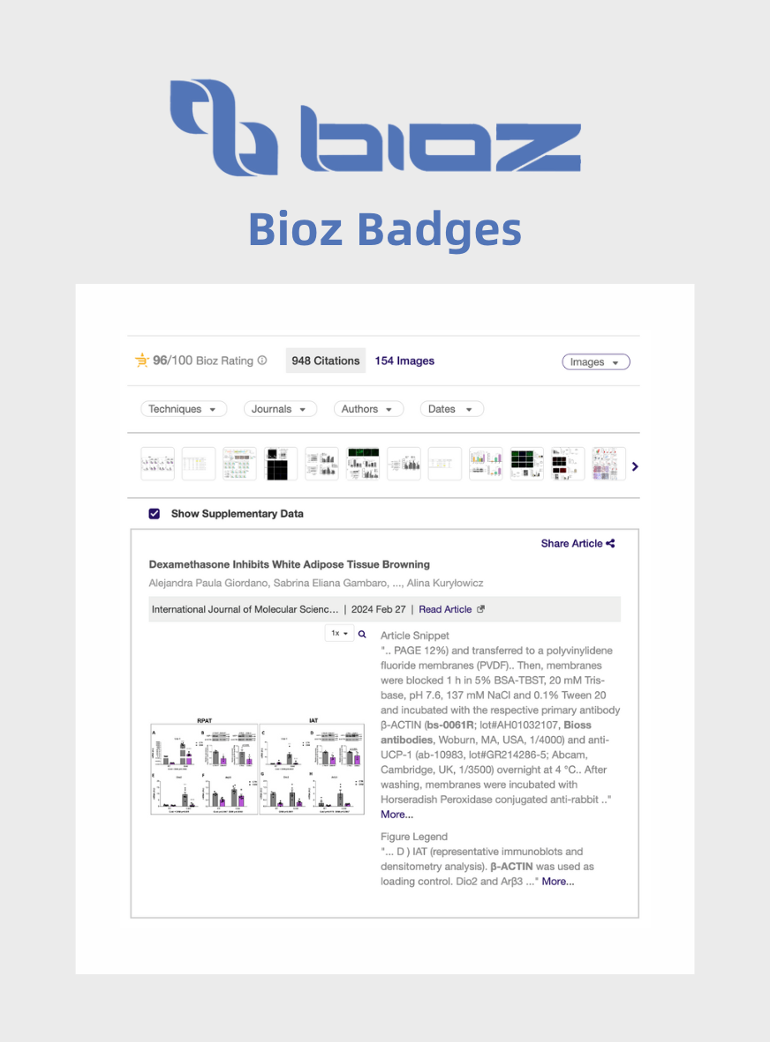 To help support scientists in selecting the optimal products for their research, Bioss Antibodies is now displaying Bioz Badges on their product web pages. Bioz Badges are AI-powered digital citation widgets that display real-time article citation data, offering excerpts and images from peer-reviewed publications, live citation counts, and objective Bioz Stars ratings. By displaying the most up-to-date citation data directly on product web pages, researchers can make well-informed decisions about products based on real application data.