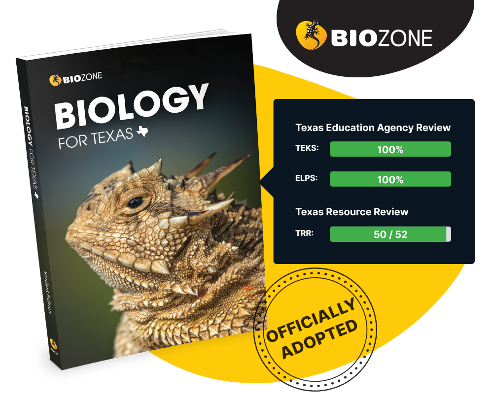 BIOZONE's Biology for Texas has been specifically tailored to align with the Texas Essential Knowledge and Skills (TEKS) for Science (High School Biology). The program features high-quality infographics, an inquiry-driven pedagogical approach, and a unique, interactive worktext format that encourages direct interaction with the content. The integration of English Language Proficiency Standards (ELPS) throughout the material enhances critical thinking and language skills within the science classroom.