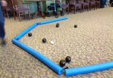 The game's organizers are gathering together their equipment arsenal of two sets of carpet bowls, a jack, six water noodles with Velcro as obstacle bumpers, and masking tape to serve as the starting point. Their variation of lawn bowls will have them setting up a rink for two teams to compete with one another on either side. The rules are simple and fair even if the teams aren't matched in number: Each player at the front of the queue will stand behind the masking tape marker and throw two bowls, in rotation with the other team, followed by the next two players in line, to complete the end. After the score is recorded, the organizers retrieve the bowls and the second end begins with the next set of players in line. For a bit of challenge and excitement, the water noodles will be arranged for the bowls to rebound off of.
