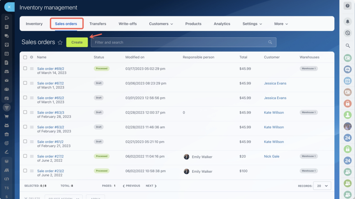 When a salesperson closes a deal, the platform generates a sales order. This digital record captures product details, price, and customer info in one step. Since the software handles the "write-off" of the product automatically, the warehouse team can begin packing immediately without waiting for manual updates or email confirmations.