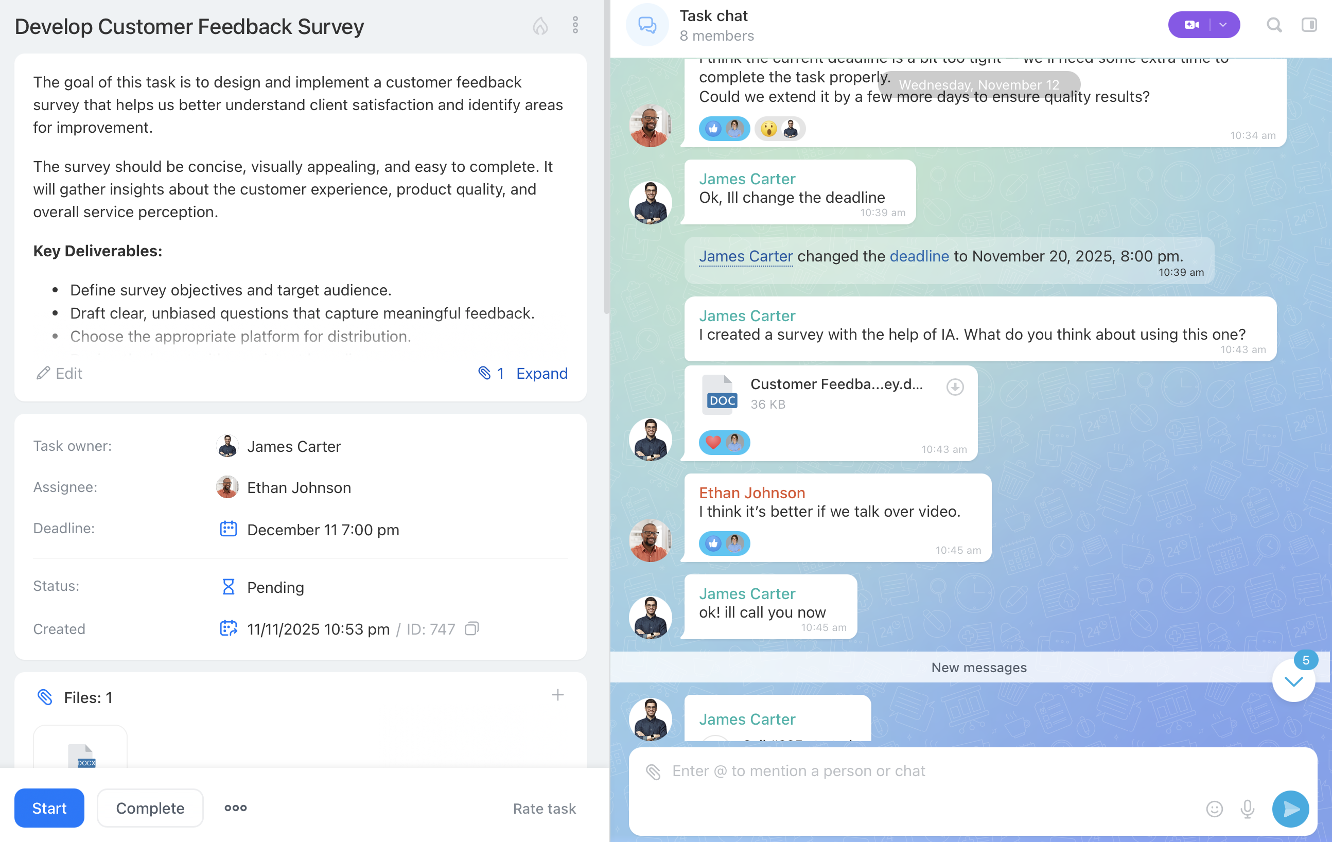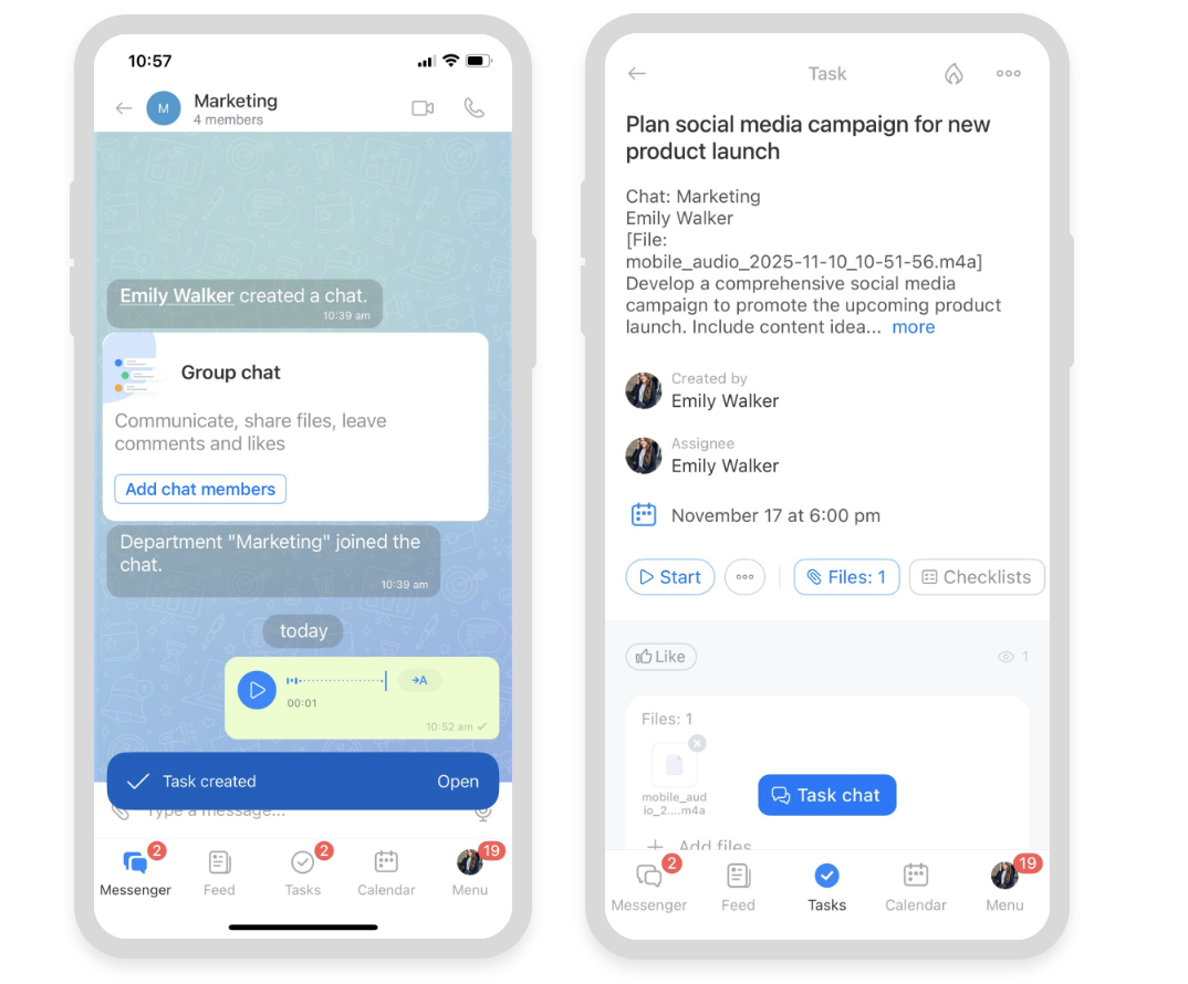 The redesigned task form gives teams a clean, easy-to-follow space where everything is in one place. The layout is simple. Information is grouped into clear sections so anyone can instantly understand what needs to be done. And right inside the task is a built-in chat that keeps every message, file, call, and update organized and visible.