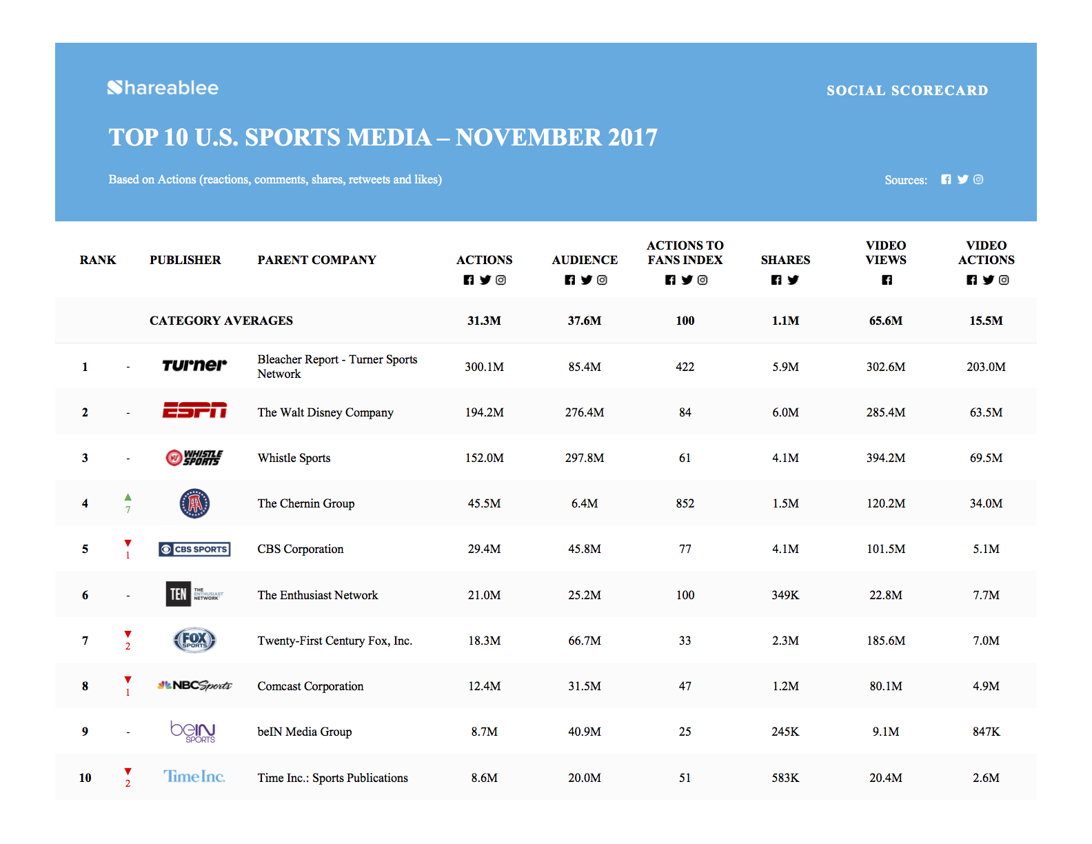 Turner’s millennial-focused Bleacher Report brand led all sports media publishers in November in total actions – a composite of reactions, comments, shares, retweets and likes – with 300.1 million. Bleacher Report, which held the same spot in October, gained 11 percent among total actions, while also increasing its video views by 4 percent to 302.6 million.