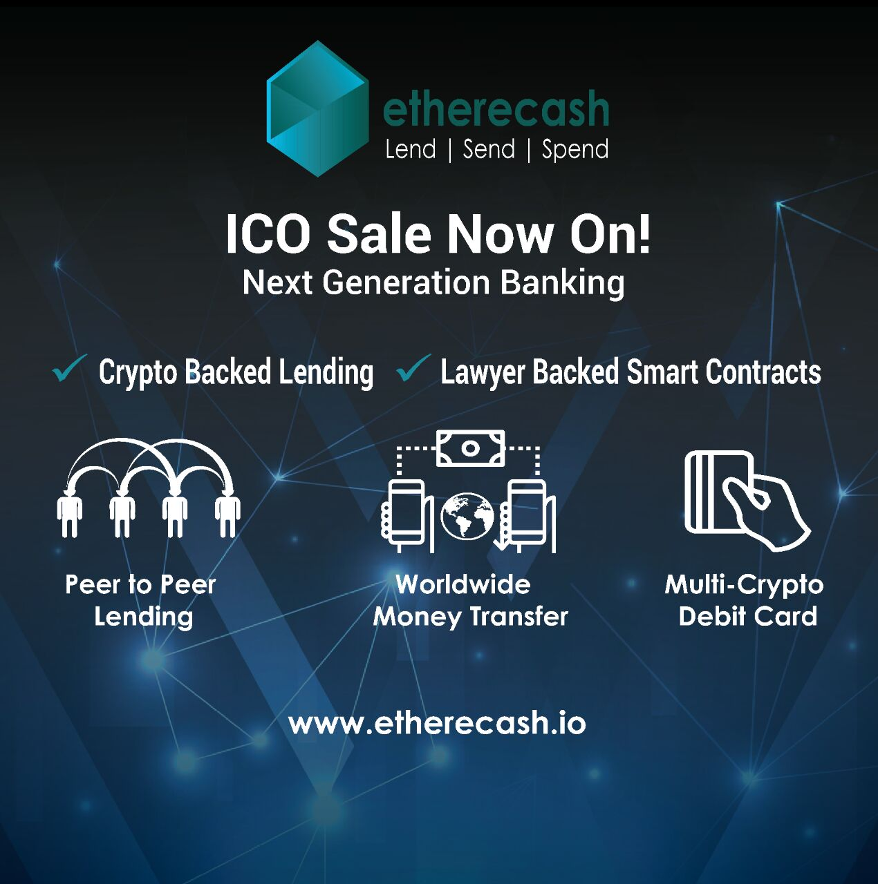Etherecash is a three-prong financial platform enabling peer to peer lending, global money transfer and a crypto debit card, which allows its users to maximise the potential of their assets and leverage cryptocurrency to secure fiat loans. The platform uses lawyer-backed smart contracts and blockchain technology to offer full transparency and security for its users. The Etherecash platform is a complete ecosystem to bring speed, security and reliability in the way we lend, send and spend.