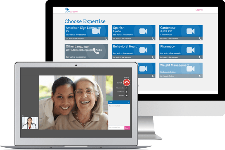 Bluestream includes tools for FQHCs to manage queues of patients (virtual and physically present), longitudinal reporting, and seamlessly blend on-demand and scheduled visits. Interpreter service in over 200 languages and ASL is built into the solution and available during a video visit with a single click.