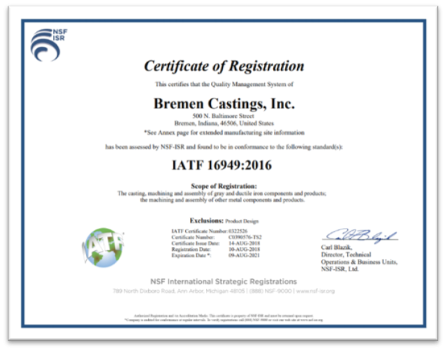 Bremen Castings Inc. Receives ISO 9001:2015 / IATF 16949:2016 Certification