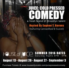 Brooklyn, NY, July 20, 2016 (Newswire.com) - Healthful four-part summer comedy and visual art series Juice: Cold-Pressed Comedy is blending two modes of self-expression to unite the evolving local community and encourage healthful modes of entertainment. Presented by House of Juice, a garden-to-cup juicery that uses local organic sources, the series will take place Saturday August 13, August 20, August 27, and September 3 from 8PM-9PM at 642 Rogers Avenue in Prospect Lefferts Gardens.