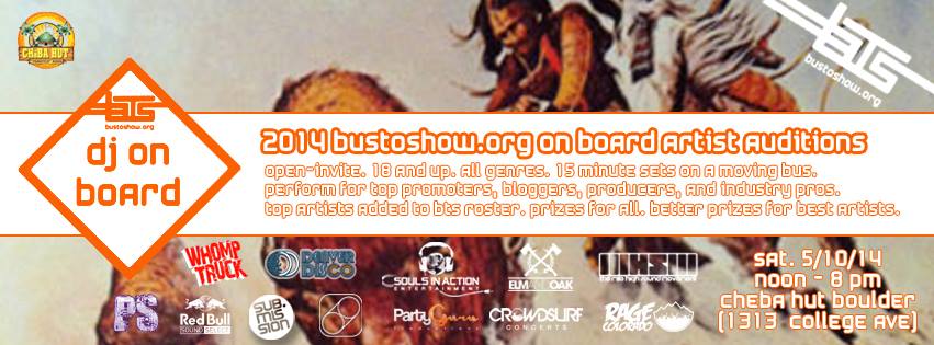 For the second year in a row Bust to Show is holding its onboard artist competition on May 10. DJs have fifteen minutes to impress judges while playing on a moving bus. The judges will be some of the biggest promoters and bloggers from the Colorado music industry.