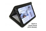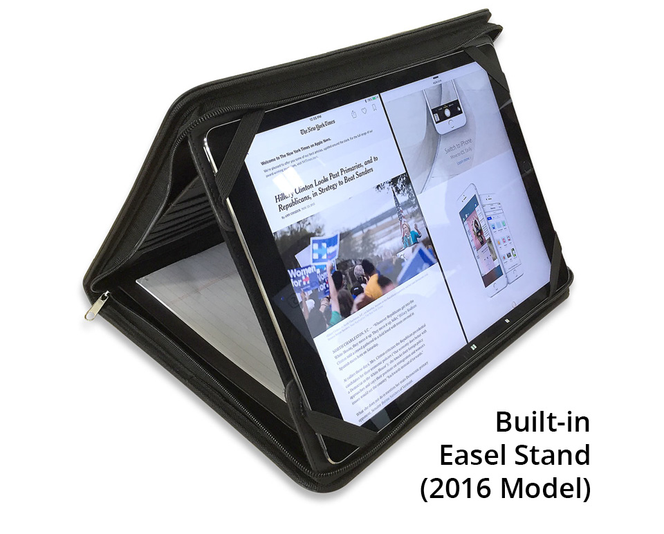 Visual presentations are key to making a sale. A picture (or video) does speak a thousand words. The 2016 model of the Business Leather Portfolio features a built-in easel-stand which allows easy demonstrations with a tablet, keeping the hands free and also maintaining a polished look https://www.sunrisehitek.com/product/ipad-business-leather-portfolio. The 2016 model also has elastic corners to keep the tablet in place when in or out of use.