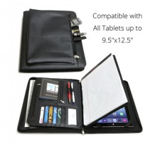 The Business Tablet Portfolio offers excellent protection for virtually any tablet computer, plus ample storage for business professionals on the go. It features a unique Universal Corner system which adjust to perfectly fit any size tablet. The case itself is made of high-grade leatherette, offering tough protection for day to day use. An exterior zipper pouch provides easy access for bulky items such as keys and calculators, while the expandable file folder offers plenty of storage for documents, brochures, and catalogs. A micro-fiber divider is sized perfectly for a 8.5"x11" notepad, protects the tablet's screen from scratches.
