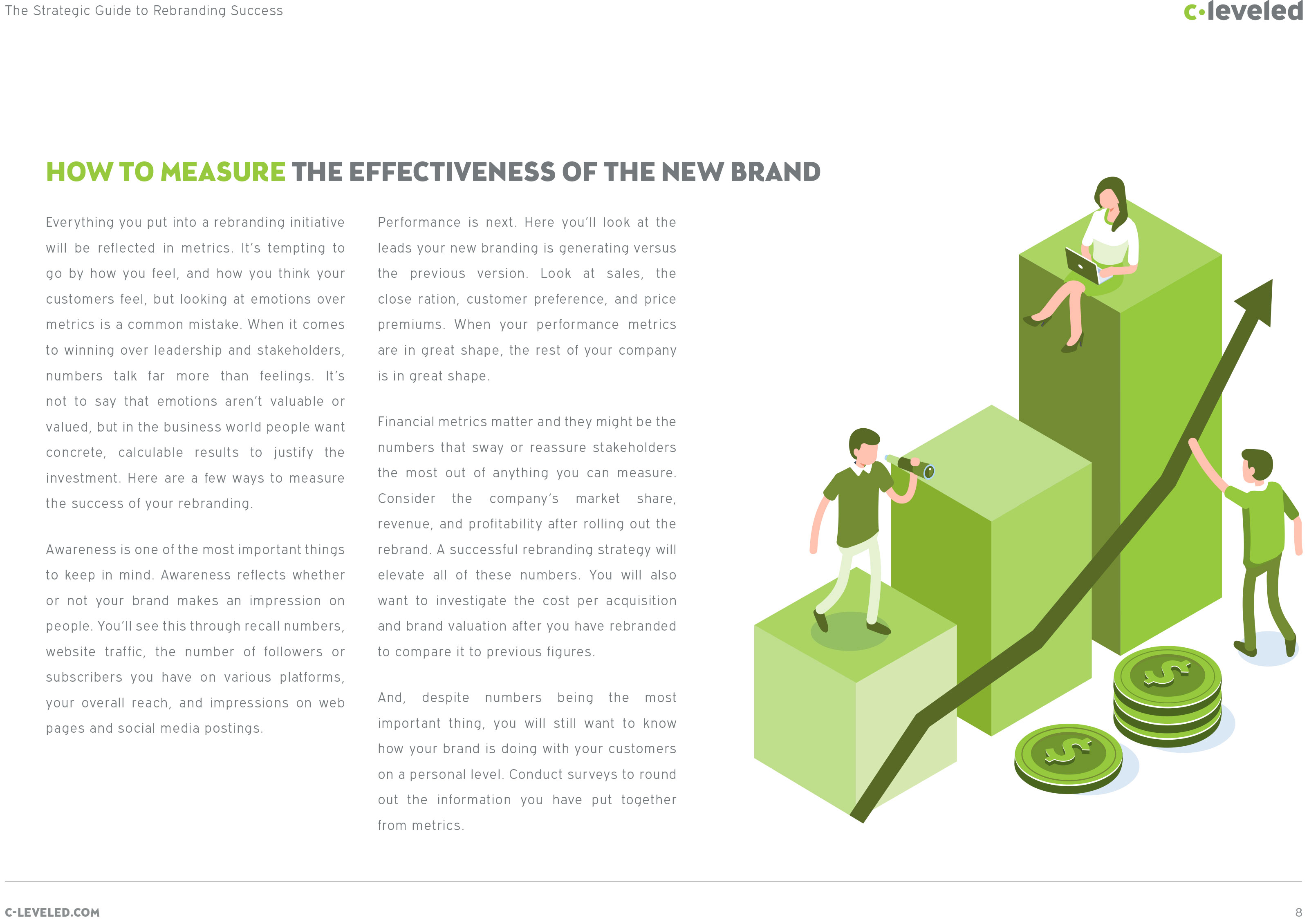 The guide finishes by explaining how to execute a new brand launch so that it creates an impact and communicates the key messages. The guide also details how to measure the effectiveness and the return on investment. If that wasn’t enough, C-leveled has even included a section on securing longevity for a brand, as well as how to budget for the investment that rebranding requires.
