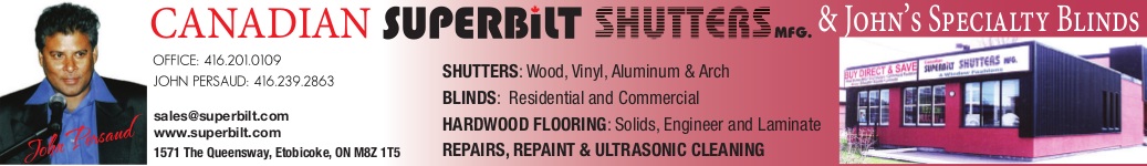"The new website helps showcase our new images of various window shutters projects that we have worked on as well as highlighting the fact that we also work with blinds and hardwood flooring," explained John Persaud of Canadian Superbilt Shutters. "We invite everyone to connect with us on our new social media profiles on Facebook and Twitter," added Persaud.