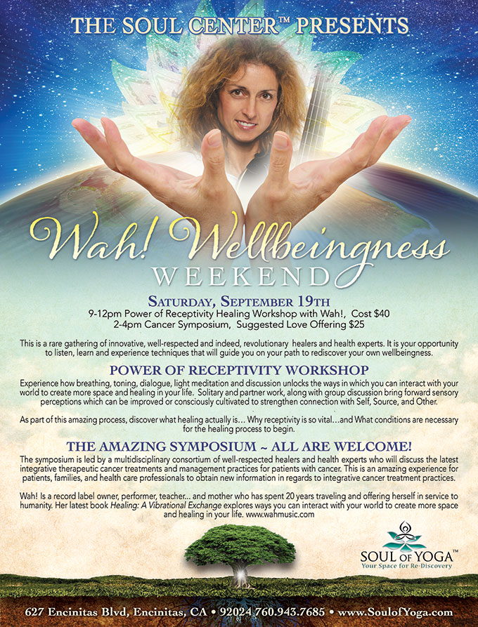 Wah! Wellbeingness Weekend, Soul of Yoga, 627 Encinitas Boulevard, Encinitas, Ca, 760-943-7685, September 19th and 20th with Concert at San Diego Planetarium, at the Rueben H. Fleet