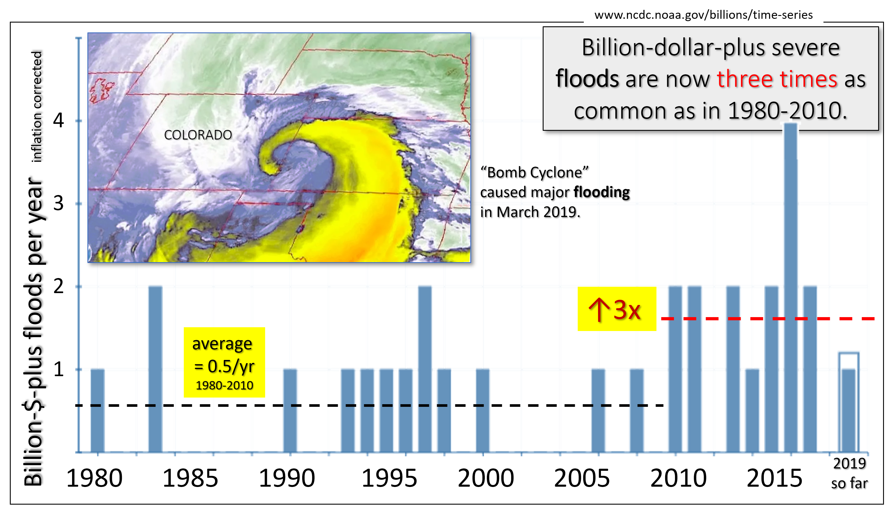 NOAA, he says, has been diligently tracking billion-dollar floods each year in the U.S. In the 30 years before 2010, once corrected for inflation, only 14 had a billion-dollar (or worse) flood. “We are now averaging 1.6 billion-dollar-plus floods each year, starting in 2010. Triple. And that is excluding the hurricane flooding.”