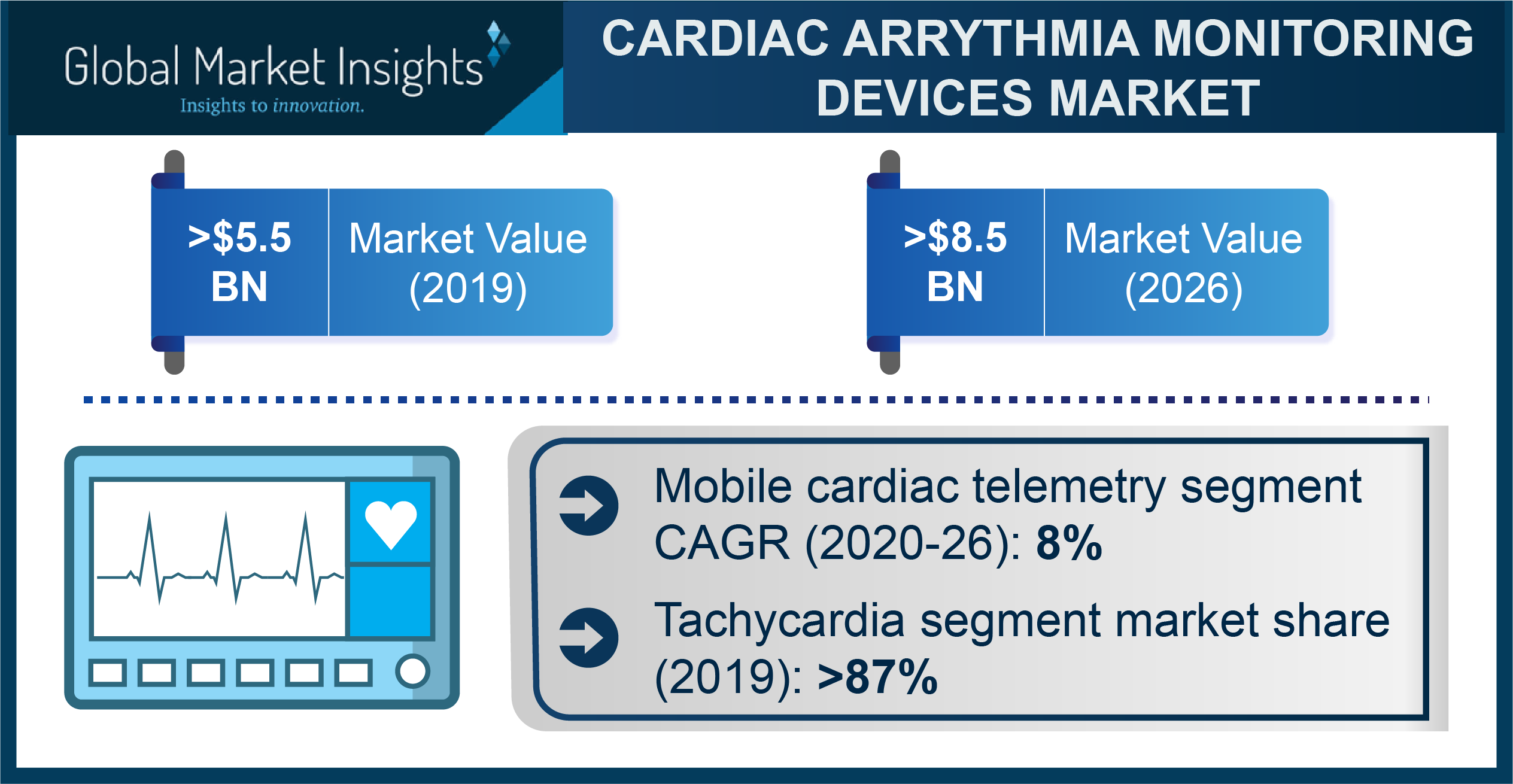 SELBYVILLE, Del., August 20, 2020 (Newswire.com) - According to the latest report “Cardiac Arrhythmia Monitoring Devices Market by Devices (Holter Monitor, Event Recorder, Mobile Cardiac Telemetry, Implantable Cardiac Monitor, Electrocardiogram {ECG} Monitor), Application (Tachycardia {Atrial Tachycardia, Ventricular Tachycardia}, Bradycardia, Premature Contractions), By End-use (Hospitals and Clinics, Diagnostics Centers, Ambulatory Surgical Centers, Homecare Settings), Regional Outlook, Price Trends, Competitive Market Share & Forecast 2026”, by Global Market Insights, Inc., the market valuation of cardiac arrhythmia monitoring devices will cross $9 billion by 2026. The rising number of novel product launches with enhanced detection and portability features will spur the market growth.