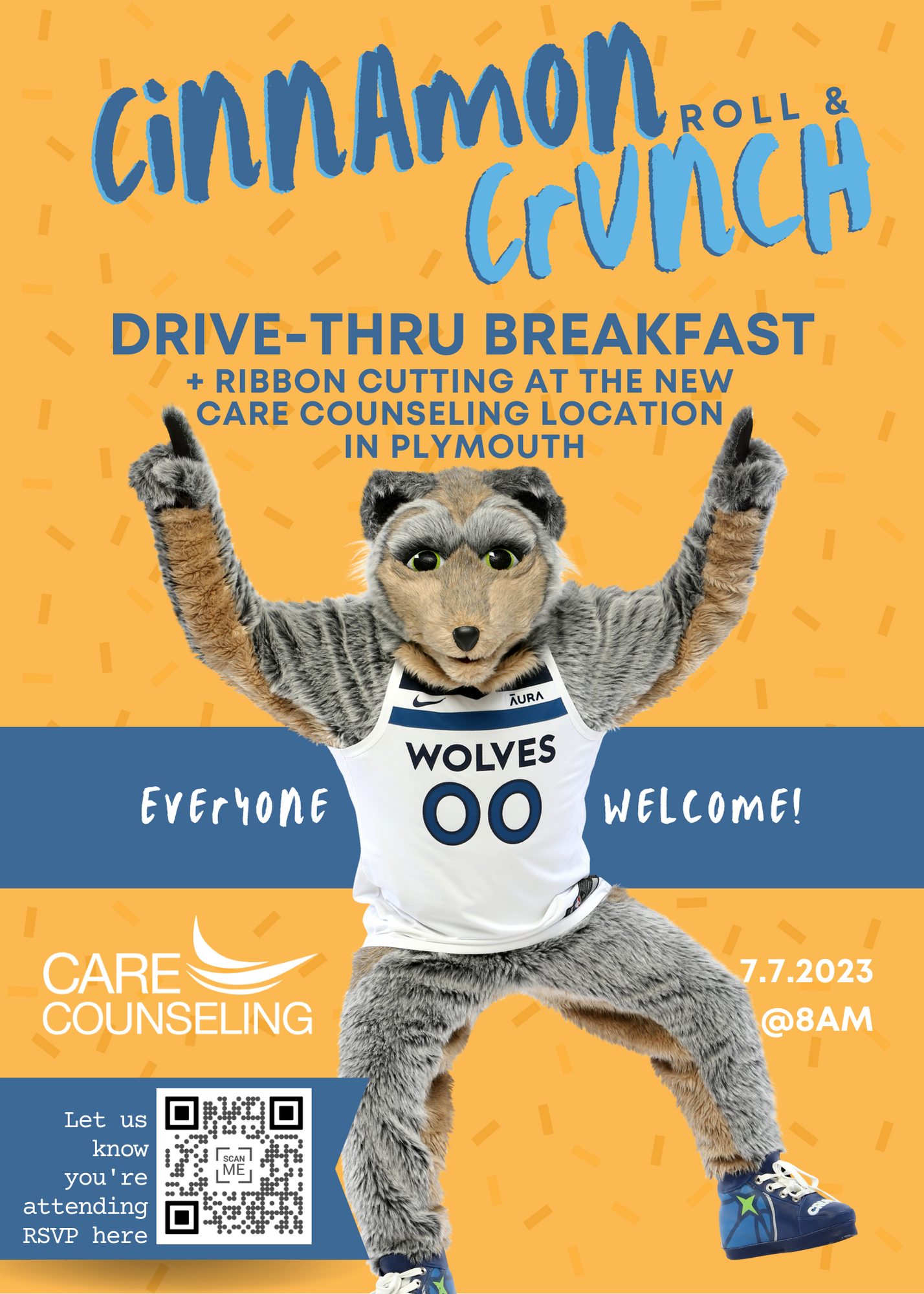 In a delightful addition to the event, CARE Counseling is honored to announce that Crunch, the beloved mascot of the Minnesota Timberwolves, will be present to join in the celebration. With his infectious energy and captivating personality, Crunch will bring an extra dose of joy and excitement to the occasion, making it an unforgettable experience for attendees of all ages. CARE Counseling is a proud partner of the Minnesota Timberwolves and Lynx.