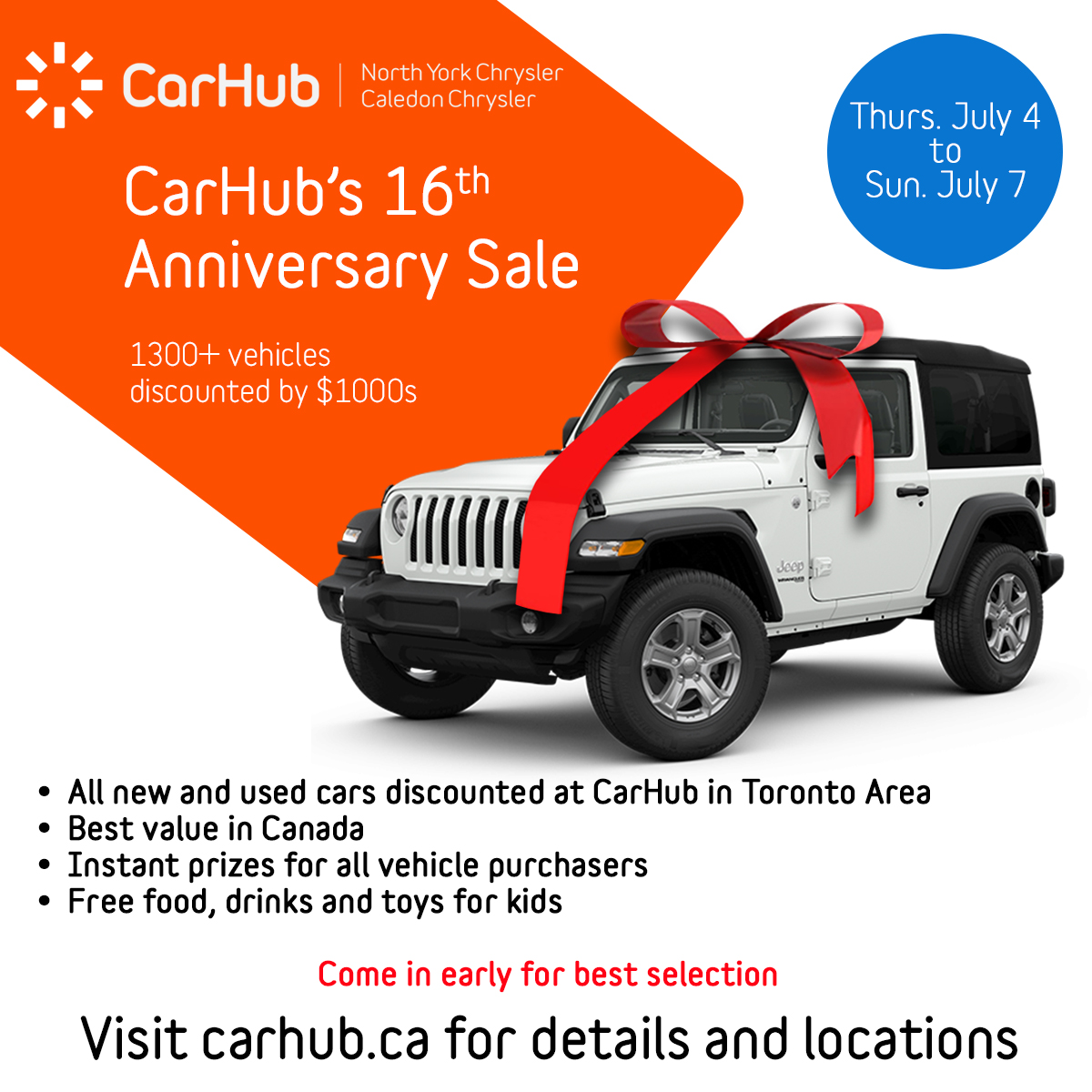 TORONTO, July 2, 2019 (Newswire.com) - CarHub is announcing its 16th Annual Anniversary Sale, which will be held Thursday through Sunday, July 4-7 at all their locations, including North York Chrysler and Caledon Chrysler. The sale has gained much attention over the past few years, due to the heavy discounts. More than 1,300 new and used vehicles will be deeply discounted this year.