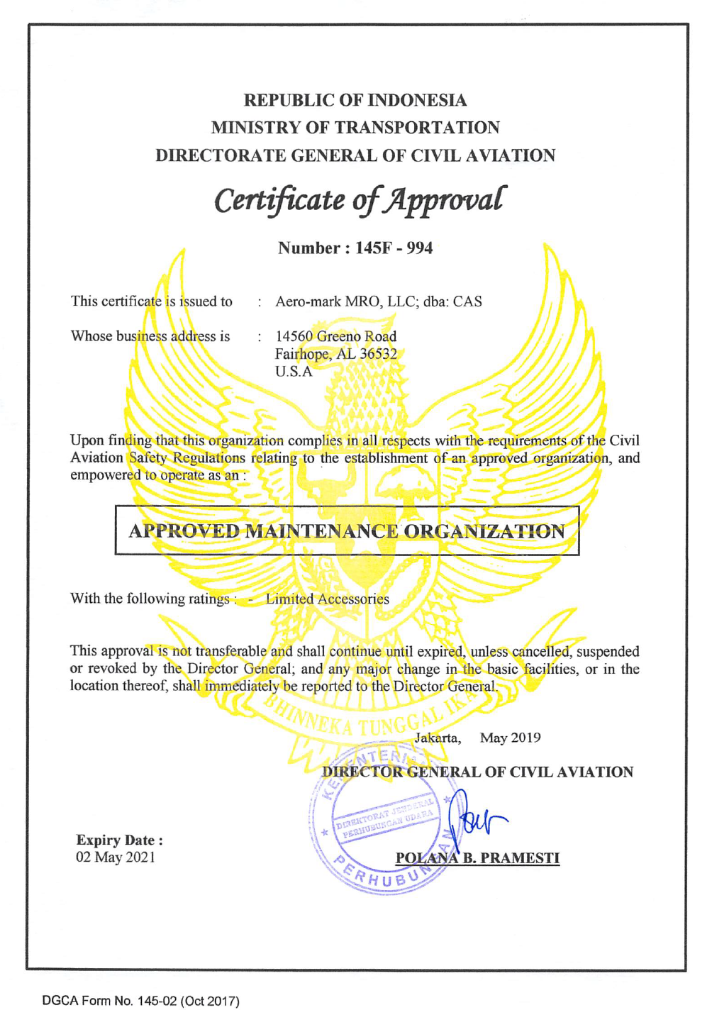 Tags: Alabama, Authorization, Aviation, CAS, Certificate, Civil, Component, DGCA, Fairhope, Indonesia, MOB, Republic of Indonesia
