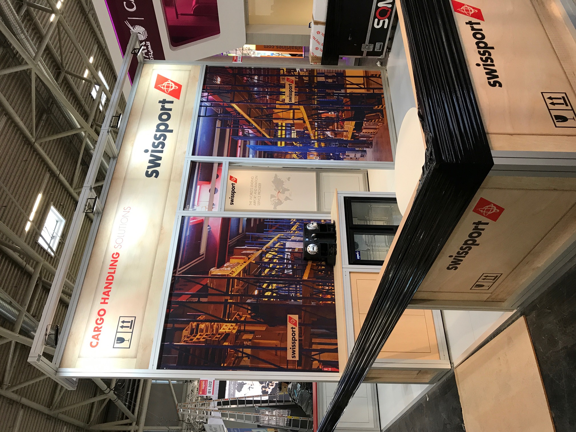 So what was Aspect looking at? Well, they had a stand space measuring 5 x 7 metres and open on all four sides. Swissport’s brief was for Aspect to create a stand of two halves. One half would be open and inviting for visitors, giving a clean, modern look and feel. The other half was to represent a mocked-up warehouse, its design to feature printed graphics to represent wooden packing crates.