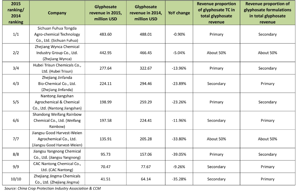 There were about 30 companies producing glyphosate TC and the several hundred enterprises producing glyphosate formulations in China in 2015, according to CCM’s research. Based on the revenue from glyphosate business, CCM ranked the top 10 Chinese glyphosate companies in 2015.