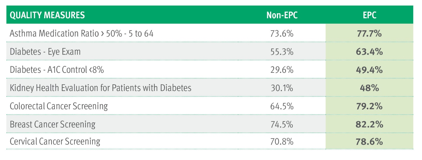 In addition to cost savings, EPC sites have been proven to move the needle on key quality metrics, outperforming non-EPC sites in the areas of asthma care, diabetes care, cancer screenings, and more.