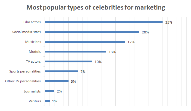 The same study also interviewed several celebrities, and of those surveyed, 40 percent said they thought professional athletes were the most effective form of celebrity endorsement. Actors were chosen by 35 percent, and musicians by 16 percent. Reality show stars and online personalities were chosen by 5 percent, and the last 5 percent chose political figures.