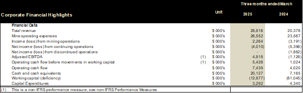 Mark Brennan, CEO and Chairman commented, "The results from the first quarter demonstrate robust and improving production from our Heap leach operations; delivering strong cashflow to support our growth initiatives. We have successfully expanded and improved our crushing capacity at MDN, which will yield greater production and cashflows moving forward. Likewise, the preparation for underground development and production have added costs but will add to our production and cash flows starting in July. The strong cash flow combined with our cash balance has enabled us to continue to pay down debt at MDN, and will allow us to continue to deploy capital at our high-grade Mont Sorcier DRI iron project and our well advanced and highly prospective Lagoa Salgada Project."